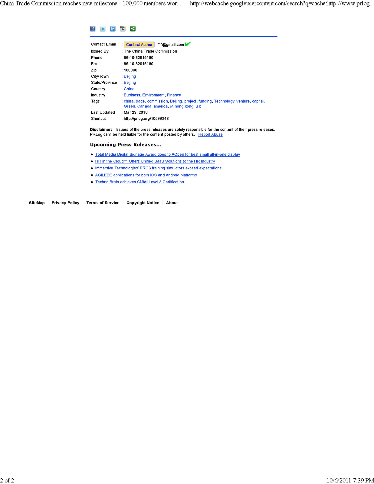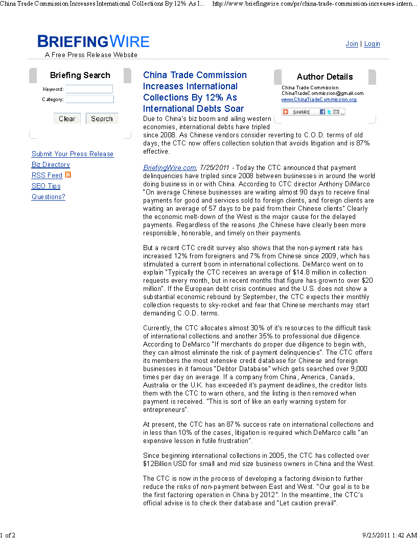 However, there is no independent mention of the China Trade Commission on the internet except for a few news articles in late 2009 and 2010 stating that they put on some children's shows. CTC has circulated many free press releases, the bulk of which are in 2011 after their domain was registered, though there are a few in 2010 and 2009. Outside of their own free press releases, there is no record at all of the China Trade Commission offering any of the many services they claim to offer.