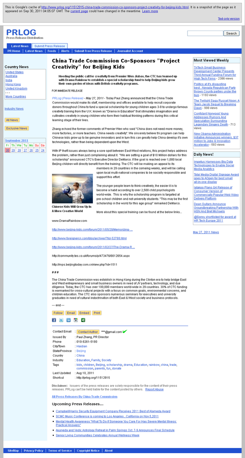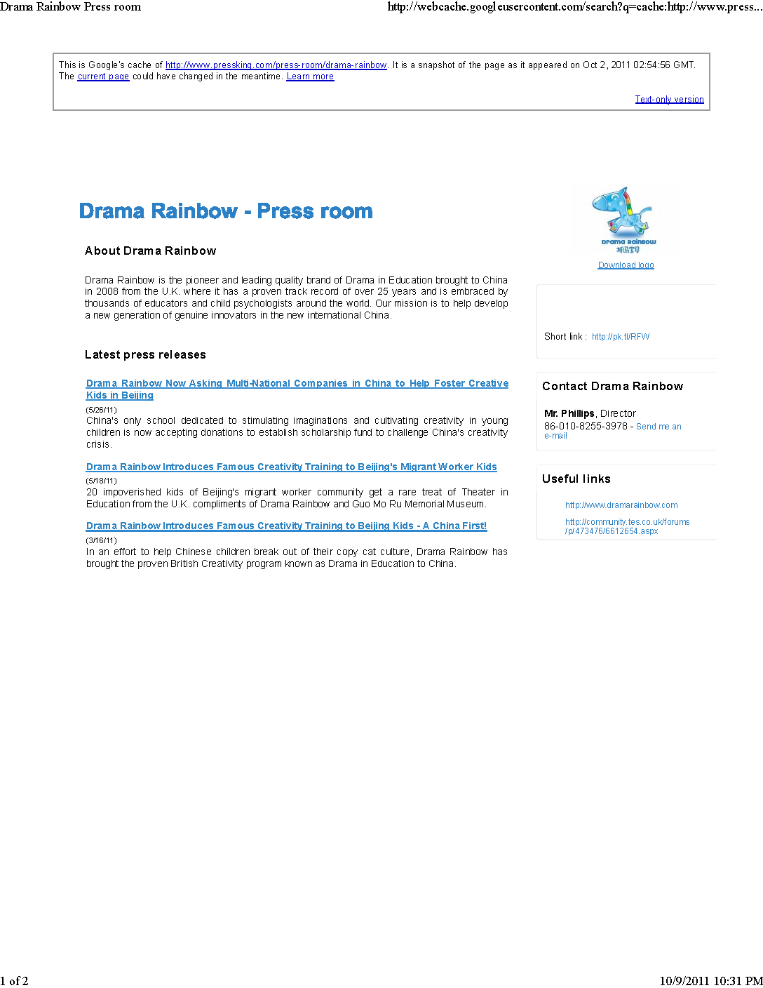 Mr. Phillips, DirectorUpdate: Ooops, Drama Rainbow or Dimarco changed the phone number on all their Press King press releases after October 1, 2011 to 86-010-8255-2978. I'm using the cache however that will be replaced. The original press release still shows 86-010-8255-3078 and it can be seen below: image 10. "Someone" also changed the phone number on the Drama Rainbow www.pressking.com Press Room, however, a screenshot of that is below as image 11. They changed the telephone number on this free press release also: Drama Rainbow Introduces Famous Creativity Training to Beijing's Migrant Worker Kids. The original can be seen below, with the telephone number, 86-010-8255-3078, image 12 Now why would they do that if they weren't trying to hide something? Moreover, there is a press release they apparently couldn't alter: Drama Rainbow Introduces Famous British Drama in Education Beijing Kindergarten Kids TiE shows